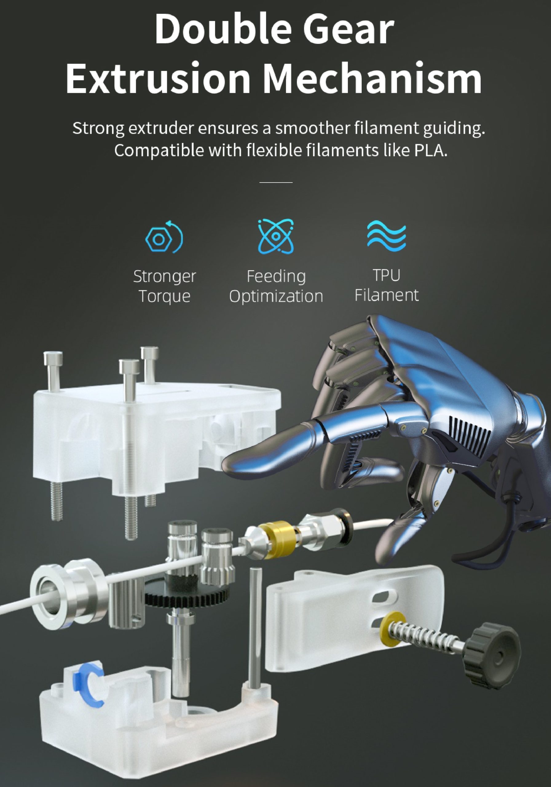 Міцний модернізований екструдер забезпечує точніше подавання філаменту, завдяки чому ви зможете друкувати різними пластиками, включно з гнучкими, як-от TPU і Elastan.