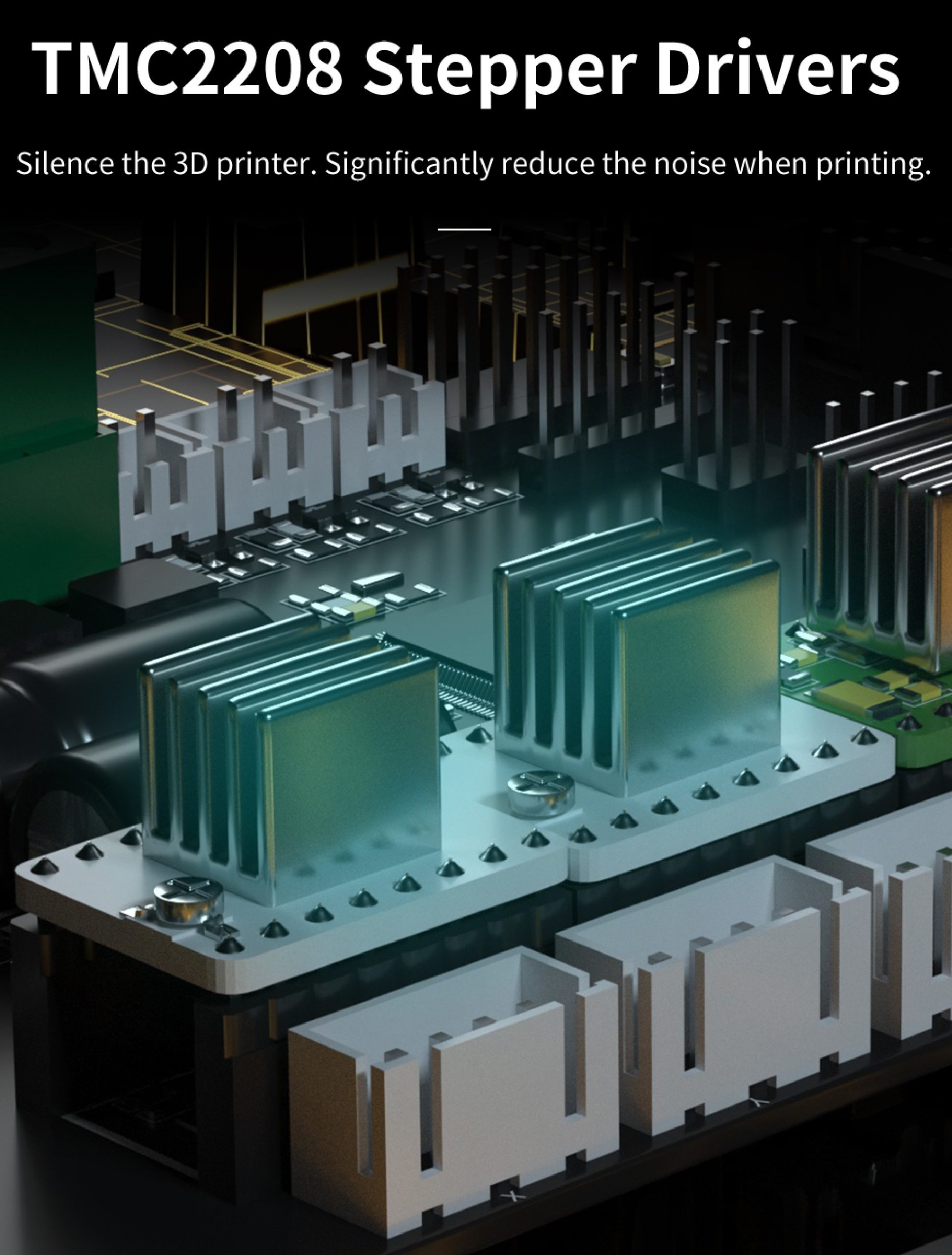 3D принтер Anycubic Mega SE обладнаний драйверами TMC2208, які знижують рівень шуму та забезпечують тихіше середовище друку друку
